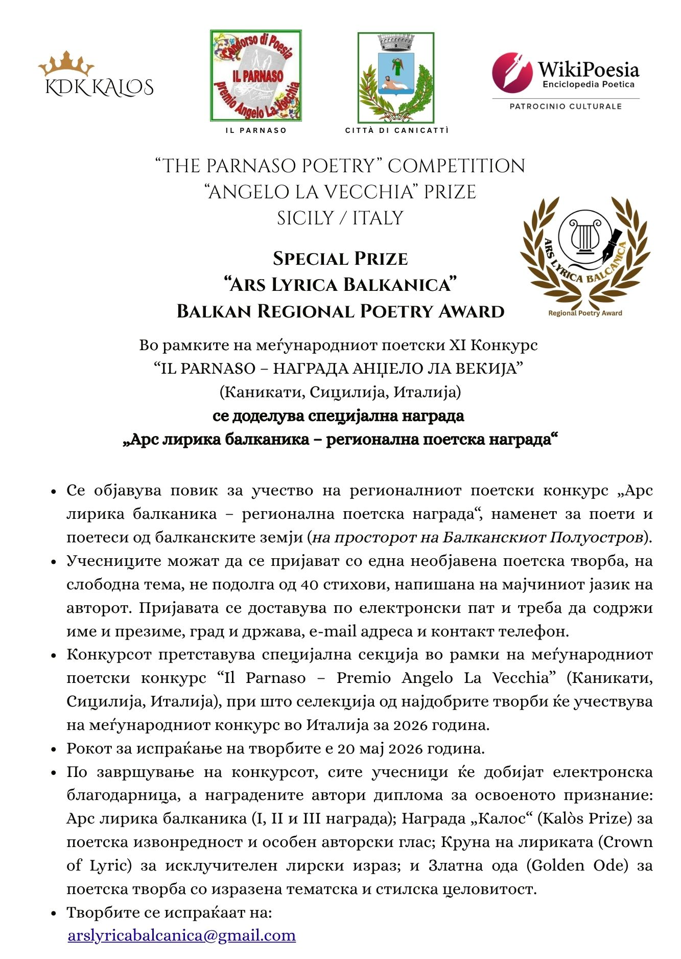Конкурсот „Арс лирика балканика“ претставува специјална секција во рамки на меѓународниот поетски конкурс „Il Parnaso – Premio Angelo La Vecchia“, кој се одржува во Каникати, Сицилија, Италија. Во таа насока, селекција на најдобрите поетски творби од Балканот ќе учествува и на наградата „Il Parnaso – Premio Angelo La Vecchia“ за 2026 година, во рамки на меѓународната соработка.