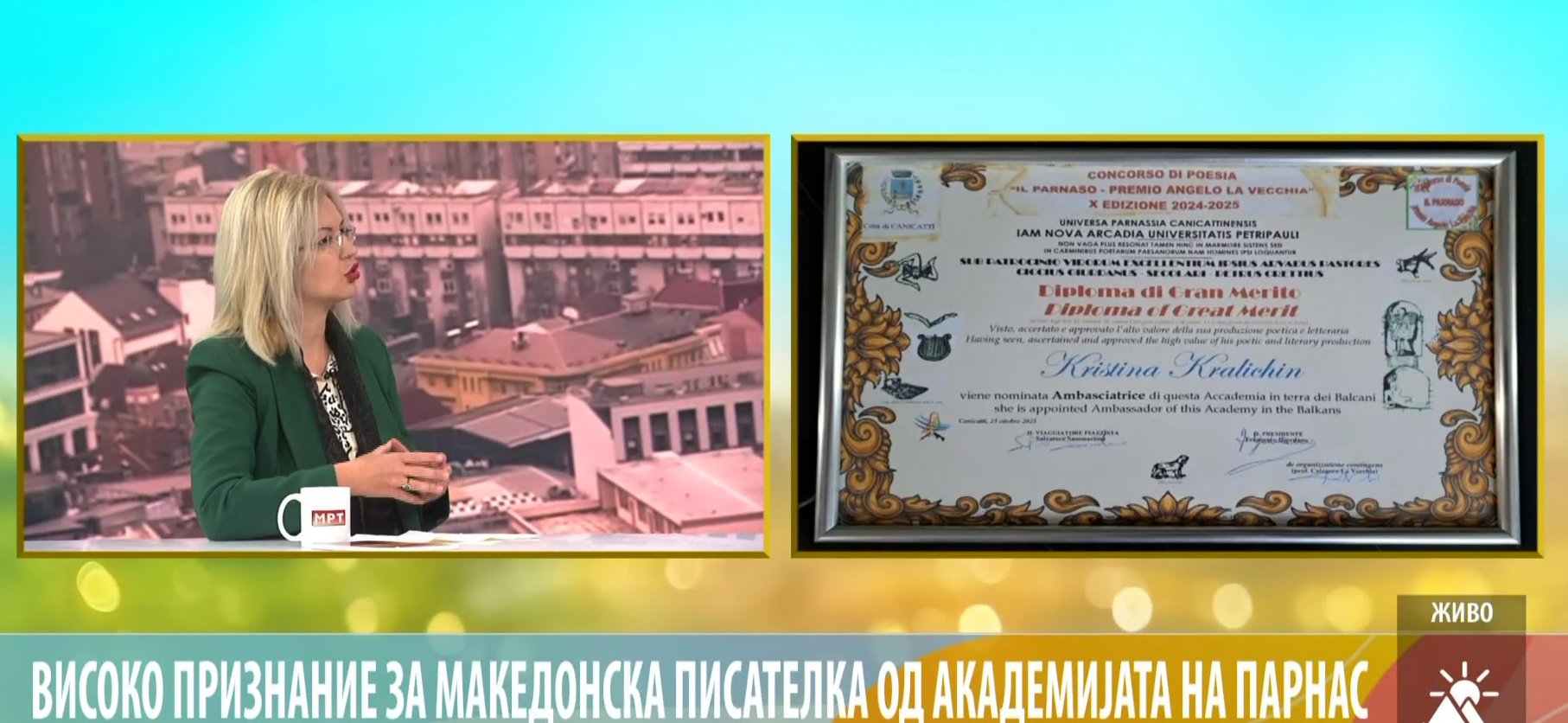 Поезијата продолжува да ги урива границите и да отвора нови културни хоризонти. Токму во таа перспектива се вклучува и престижното признание доделено на македонската поетеса и писателка Кристина Краличин, која неодамна беше именувана за Амбасадорка на Академијата Паранас за Балканот.