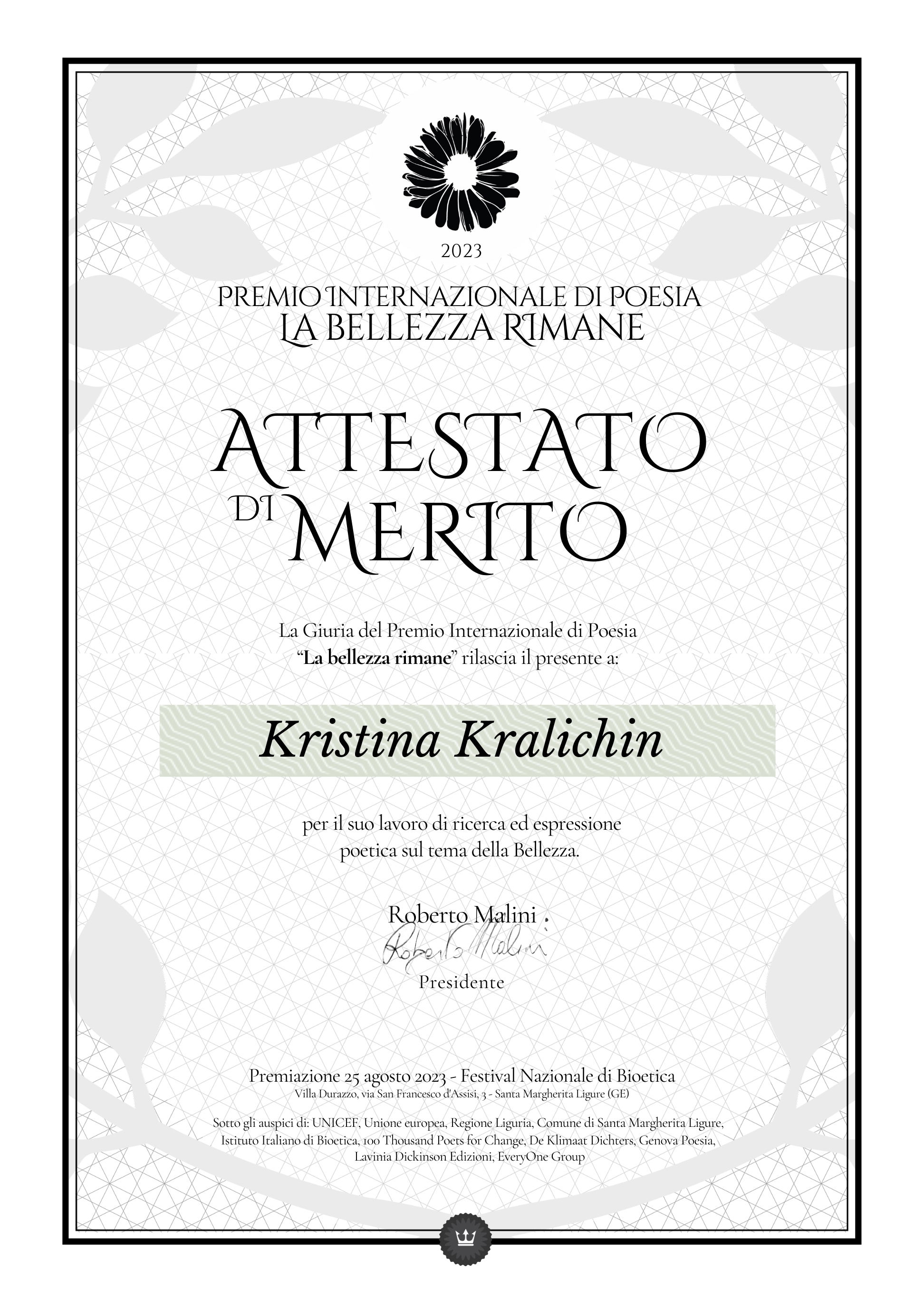 Поетесата и писателка Кристина Краличин се закити со уште едно признание во областа на литературата. Во конкуренција од над 1.200 учесници од целиот свет на Меѓународната награда за поезија „Убавината останува“ (La Bellezza Rimane), Кристина Краличин се издвои со поемата „Една насмевка“ (Un sorriso) напишана оригинално на италијански јазик.